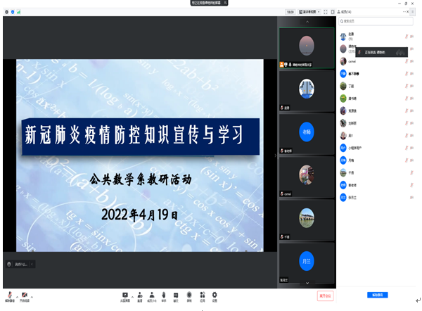 为落实贯彻学校防控办下发的“关于做好新冠肺炎疫情防控培训的通知”内容要求,数统学院公共数学系于2022年4月19日下午通过腾讯会议开展了“新冠肺炎疫情防控知识宣传与学习”的专题教研活动,公共数学系教师参加了此次会议。