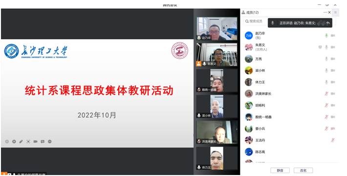 10月11日,统计系召开全系教师线上会议,学习并分享课程思政案例教学经验。会议由系主任朱恩文教授主持。会议过程中,朱主任结合时间序列分析课程的思政教学案例,详细介绍了课程思政的具体内容,包括但不限于思政教学目标、思政教学素材、思政元素引入等环节。朱主任分享课程思政教学案例后,全系老师就课程思政建设思路,课程设计等相关环节进行了热烈讨论,并就统计专业课程的课程思政建设与发展进行了规划与落实。
