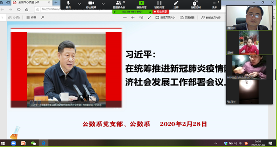 会上,公共数学系党支部书记吴烨带领大家一起学习了“习近平在统筹推进新冠肺炎疫情防控和经济社会发展工作部署会议上的讲话”精神,要求全系教师在做好新冠肺炎疫情防控工作的同时,切实落实网络线上教学的各项教学任务,确保学生学习“不断线”。