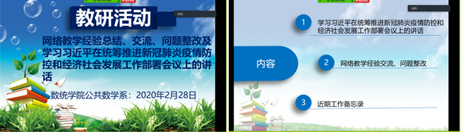 经过两周的网络教学工作,公共数学系基本形成了慕课学习与直播相结合、网络教学质量跟踪调查、系教学质量督查小组督教督学的网络教学特色。
