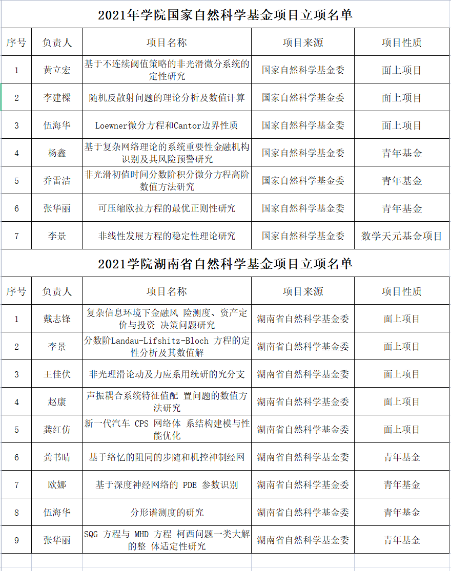 2021年我院获批国家自然科学基金项目7项,其中面上项目3项、青年科学基金3项、数学天元基金项目1项;获批湖南省自然科学基金项目9项,其中面上项目5项、青年基金项目4项。资助项目数量与经费总额均创新高。