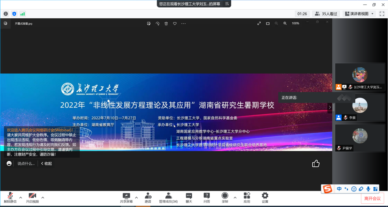 本次研究生暑期学校暨研究生博力学术论坛由湖南省教育厅主办,我校和国家自然科学基金委资助,湖南国家应用数学中心-香港六宝合典资料大全分中心、工程建模与分析湖南省重点实验室、数学与统计学院省级研究生联合培养基地共同承办。培训采用线上腾讯会议和Zoom会议的形式,设有5个专题课程讲授环节及16场学术前沿报告。