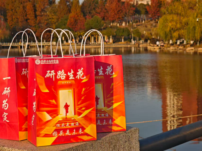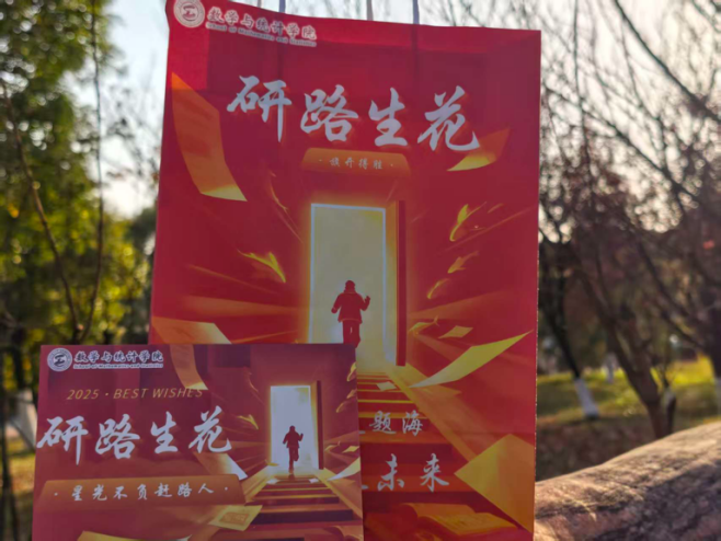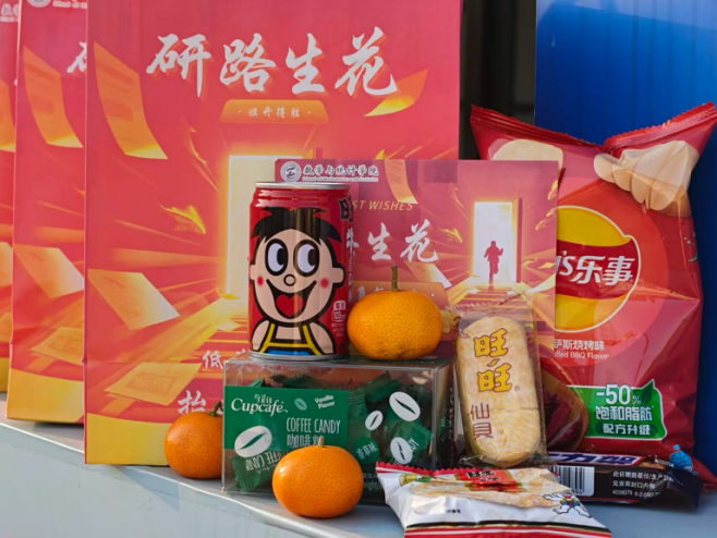 “题名墨迹犹鲜亮,今岁还同往岁芳”。件件贴心好物,句句真切寄语,皆是数统学院对考研学子最深厚的爱与温暖。印着“研路生花”的定制福袋、题有“一研为定”的数统专属明信片、寓意心想事“橙”的清甜橙子、寄寓运气“旺旺”,高分在望的旺仔牛奶与旺旺雪饼、象征“棒”上有名的甜蜜棒棒糖、代表“乐事多多”的乐事薯片、寓意横扫“饿”梦,能量满满的士力架、蕴含“先苦后甜”真理的咖啡糖——每一份礼物,都藏着老师们对学子最诚挚的期许与祝福。