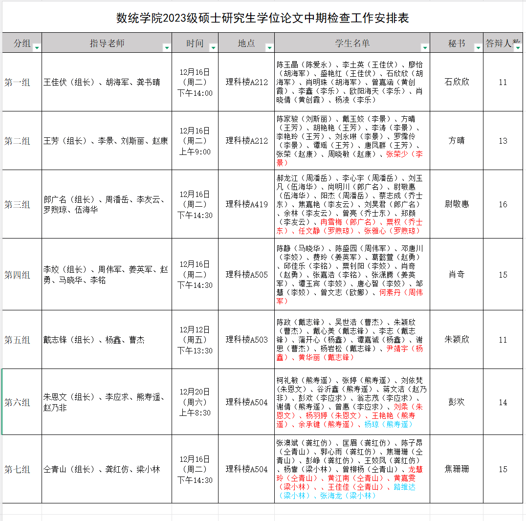 4、每组先进行现场学生答辩,后进行线上学生答辩(表中标红学生申请线上,秘书提前预约腾讯会议),如有需要更换顺序的,可在答辩现场向导师提出作出调整;
