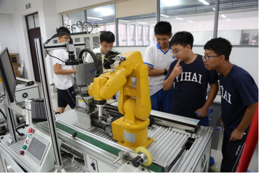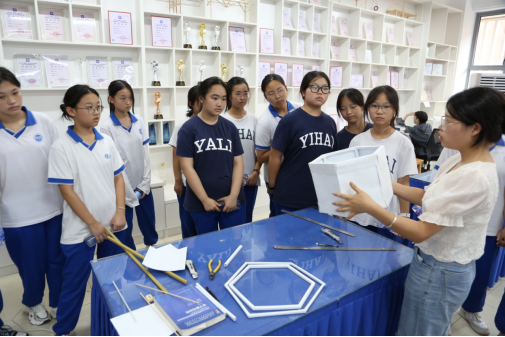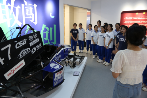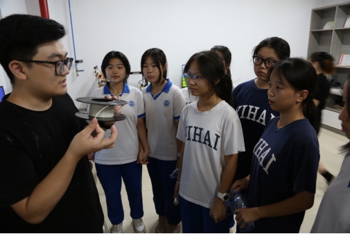 在老师和志愿者的引导和讲解下下,怡海中学的师生们首先参观了科创中心的3D打印机、结构设计训练室、先进成图训练室和电气学院的机器人实验室等地,实地感悟了我校在科学研究、技术创新、学科竞赛等方面的成果,让中学生们对科技创新有了更深刻的认识,激发了他们热爱科学、探索未知的兴趣。随后,师生们来到“三全育人”教育基地。师生们在讲解员的带领下参观了教育基地,同学们积极参与互动体验,感受大学校园文化的魅力。