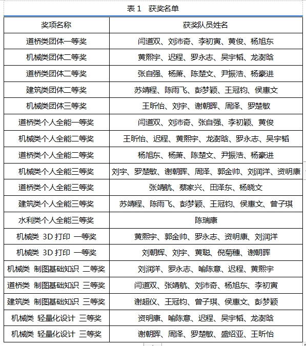 近日,第十四届“高教杯”全国大学生先进成图技术与产品信息建模创新大赛在西南交通大学成功举办,大赛采用选手云端线上参赛,专家线上线下及电脑智能阅卷等全新竞赛模式。我校机械类、道桥类、建筑类和水利类四个竞赛类别共40名参赛选手历经校赛、省赛的层层选拔,成功闯入全国决赛。在综合三维建模、尺规绘图、制图基础知识、3D打印、BIM创新设计、轻量化设计等比赛内容后,由闫道双、刘沛奇、李初寅、黄俊、杨旭东组成的团队荣获道桥类团体一等奖,由黄熙宇、迟程、罗永志、吴宇韬、龙澍晗组成的团队荣获机械类团体二等奖,由苏靖程、陈雨飞、彭梦颖、王冠钧、侯惠文组成的团队荣获建筑类团体二等奖,由张自强、杨萧、陈楚文、尹振浩、杨豪进组成的团队荣获道桥类团体二等奖,由王昕怡、刘宇、谢朝晖、周泽、罗楚敏组成的团队荣获机械类团体三等奖。在个人全能赛项中共荣获个人全能一等奖5项、个人全能二等奖11项、个人全能三等奖18项,其中道桥类总体成绩位列全国第四。在机械类3D打印团体赛中共获一等奖2项。在制图基础知识团体赛中共获二等奖1项、三等奖2项。在机械类轻量化设计团体赛中共获三等奖2项。各类别赛项具体获奖名单如表1所示。