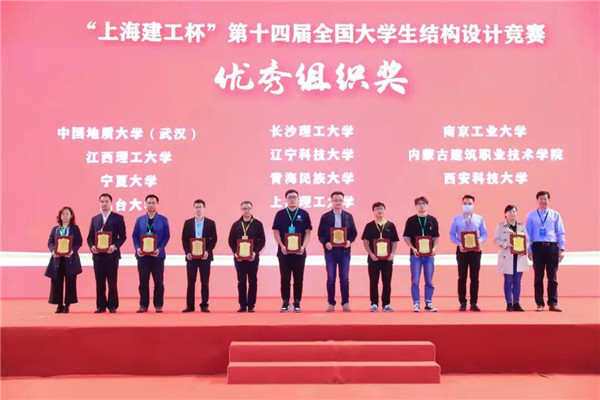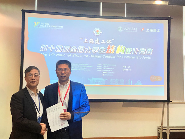 10月14日至17日, 在刚刚结束的“上海建工杯”第十四届全国大学生结构设计竞赛中,我校土木工程学院2019级本科生陈雨飞、余想斌、卿磊组成的参赛队,从众多参赛队伍中脱颖而出,以总分第2名的好成绩获得本届大赛一等奖。城南学院2019级本科生夏圣明、张中亮、20级本科生雷缮诚组成的参赛队设计作品同获一等奖。我校实现连续七届蝉联国赛一等奖(含两届冠军),同时荣获本届大赛“优秀组织奖”,土木工程学院付果副教授获得全国大学生结构设计竞赛“突出贡献奖”。