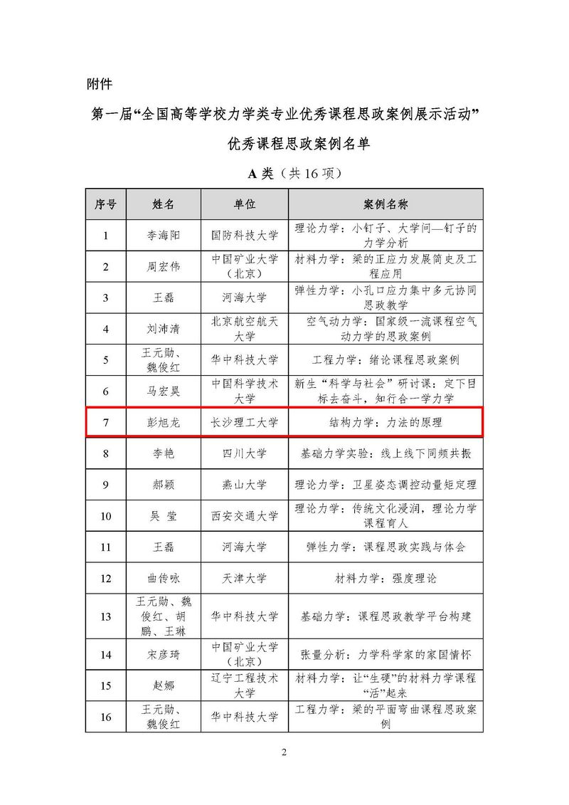 近日,教育部高等学校力学类专业教学指导委员会公布了第一届“全国高等学校力学类专业优秀课程思政案例展示活动”优秀课程思政案例的遴选结果。力学系彭旭龙副教授的“结构力学:力法的原理”获评A类优秀课程思政案例。