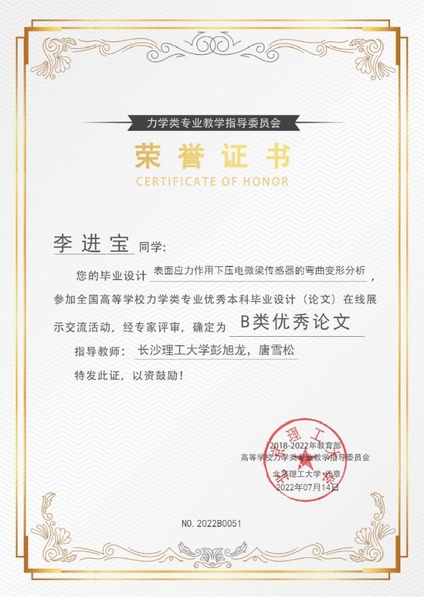近日,教育部高等学校力学类专业教学指导委员会公布了“第三届全国高等学校力学类专业优秀本科毕业设计(论文)展示交流活动”获奖名单。今年我校首次报名参加该展示交流活动,经非本单位力学专家线上评审,我院工程力学专业本科生李进宝同学的毕业论文“表面应力作用下压电微梁传感器的弯曲变形分析”(指导老师:彭旭龙副教授,唐雪松教授)荣获B类优秀论文。