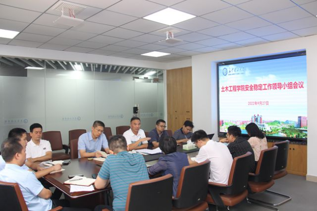 9月27日下午,我院在工二A401会议室召开安全稳定工作领导小组会议,专题研究学院安全稳定工作,研判了学院可能存在的安全隐患,再次部署安全稳定风险排查工作。副院长张永杰宣读了《土木工程学院安全稳定工作方案》,对具体工作安排做了通报布置党委书记江河传达了湖南省教育系统安全防范动员电视电话会议精神、学校有关会议及文件精神,介绍了当前安全稳定工作形势