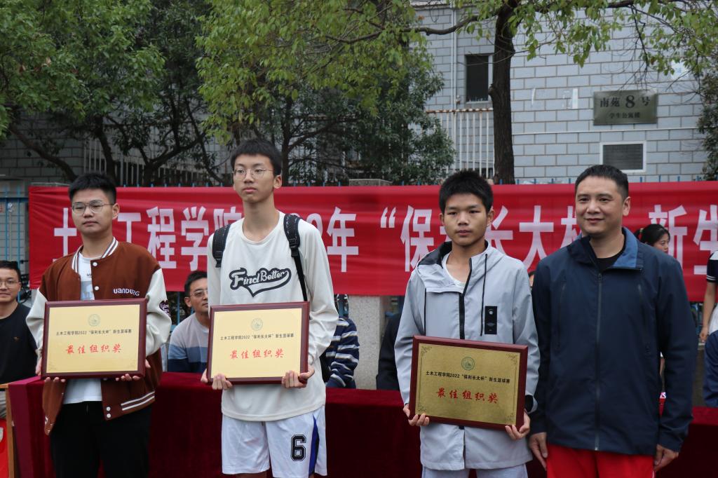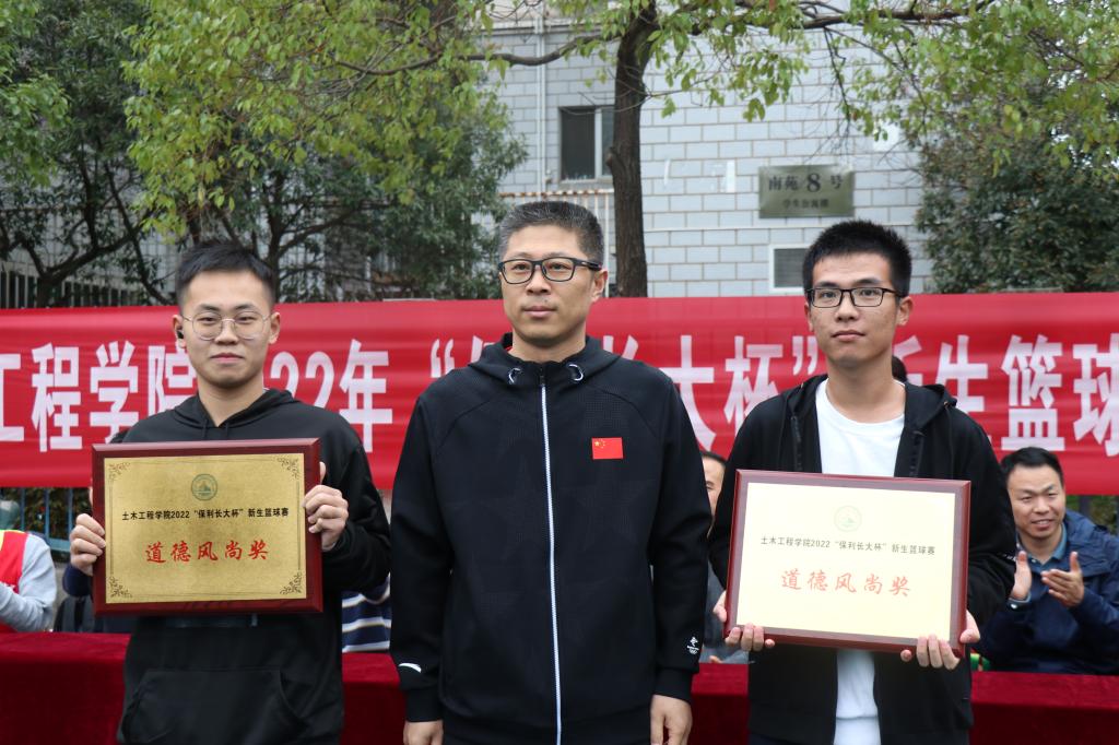 颁奖仪式上,江河、王磊等领导老师分别为获奖班级和个人颁发奖杯、奖牌,表示祝贺,并希望大家能够再接再厉,自觉将热血拼搏的篮球精神迁移到学习生活中,持续提高身体素质,实现全面发展,在青春的赛道上跑出当代青年的最好成绩。至此,土木工程学院2022年“保利长大杯”新生篮球赛圆满落下帷幕!