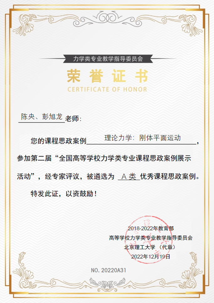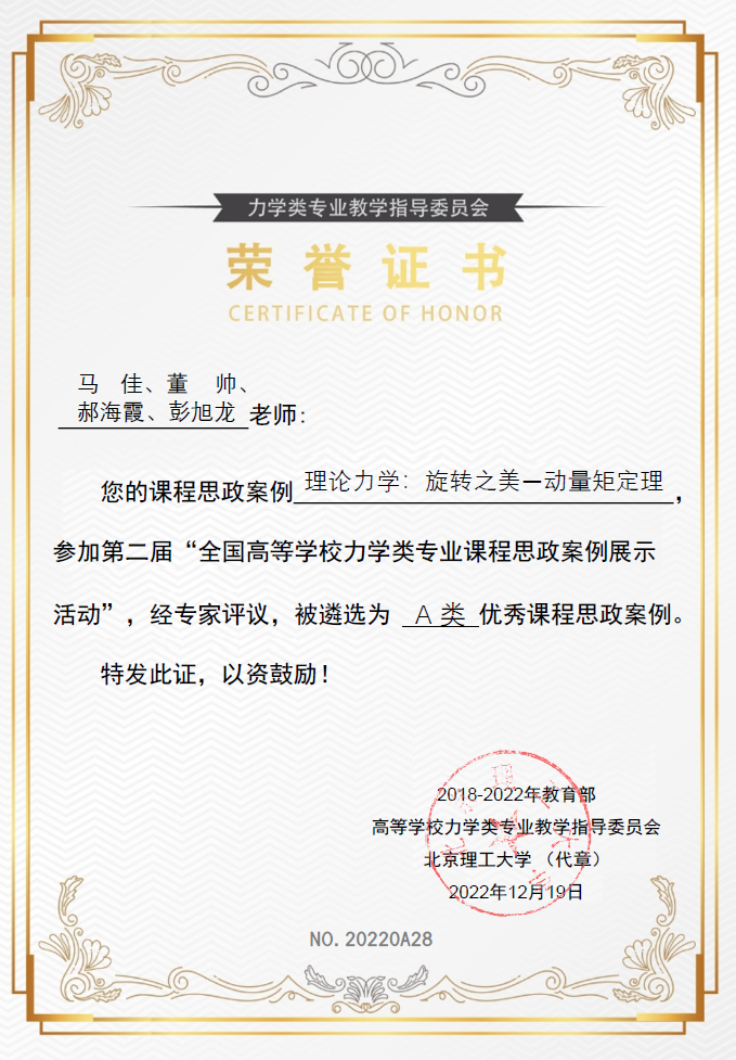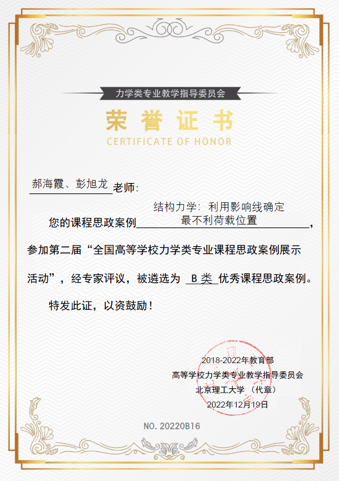 近日,教育部高等学校力学类专业教学指导委员会公布了第二届“全国高等学校力学类专业优秀课程思政案例展示活动”优秀课程思政案例的遴选结果。我校土木工程学院力学系四项参赛案例皆获表彰。其中马佳、董帅、郝海霞、彭旭龙老师所撰写的《理论力学:旋转之美—动量矩定理》,陈央、彭旭龙老师所撰写的《理论力学:刚体平面运动》分别获评A类优秀课程思政案例;韩艳、王响军老师所撰写的《流体力学:表面张力》,郝海霞、彭旭龙老师所撰写的《结构力学:利用影响线确定最不利荷载位置》分别获评B类优秀课程思政案例。