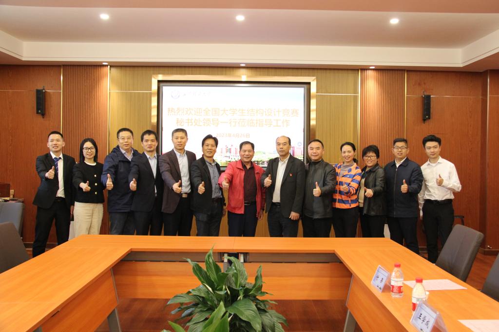 王磊首先代表学院对毛一平和丁元新副秘书长的莅临表示热烈欢迎并介绍了学校、学院的基本情况。他表示,学院全力配合赛事组委会,高质量推进赛事的前期筹备工作。全力保障赛事的顺利举办。付果从“赛题简介、未知参数、加载步骤、设备模拟、场地布置”五个方面详细汇报了前期的命题工作,并得到了秘书处专家的高度赞扬。黄阿明代表学院汇报了第十六届全国结构设计竞赛前期筹备情况,重点从“赛事经费、赛事协商、场馆准备、文稿撰写、物料设计、赛事相关准备”六个方面介绍了学院目前的竞赛筹备进展,表示学院将继续深入谋划,保障大赛筹备工作高效有序推进。