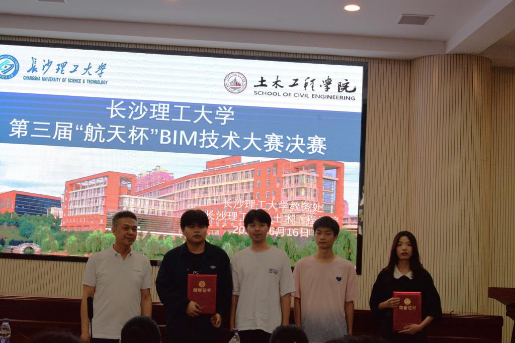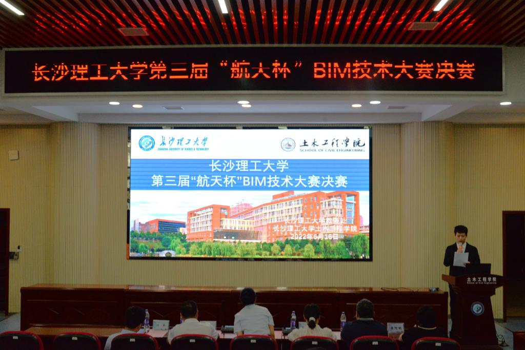为推进BIM技术应用的学习和发展,由校教务处主办、土木工程学院承办的第三届“航天杯”BIM技术大赛决赛暨颁奖仪式,于6月16日下午在工二B302举行。湖南航天建筑工程有限公司党委委员、副总经理、纪委书记苏晏,总工程师易建辉,总经理助理、人力资源部部长张月月,技术质量部部长王新槐,BIM中心主任刘子翔,人力资源部专员陈江鹭,教务处副处长吴钢,土木工程学院党委书记江河,副书记黄阿明,副院长付果以及湖南航建相关负责人与学校相关指导老师出席本次活动。本次比赛由院团委学生会科技部干事李江悦主持。