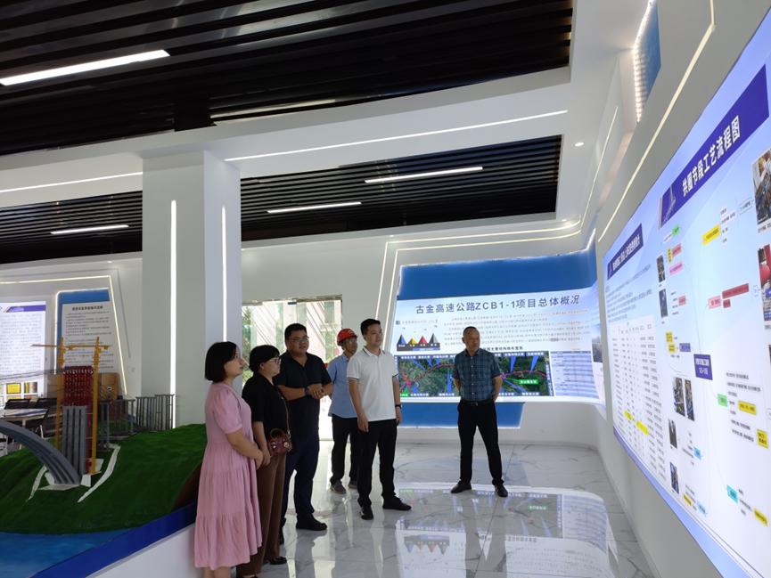 随后,师生参观了项目部智慧建造中心。曹政全面介绍了泸州经古蔺至金沙高速公路ZCB1-1项目的总体概况、项目特点、目前进展等情况。他介绍说:“水落河特大桥,为上承式钢筋混凝土悬臂浇筑拱桥,跨径335m,为世界同类型最大跨径拱桥。作为古金高速的重要控制性工程,水落河特大桥计划今年7月合龙,目前古蔺岸与金沙岸均施工到22号节段。项目预计在今年12月完成拱上结构施工。”