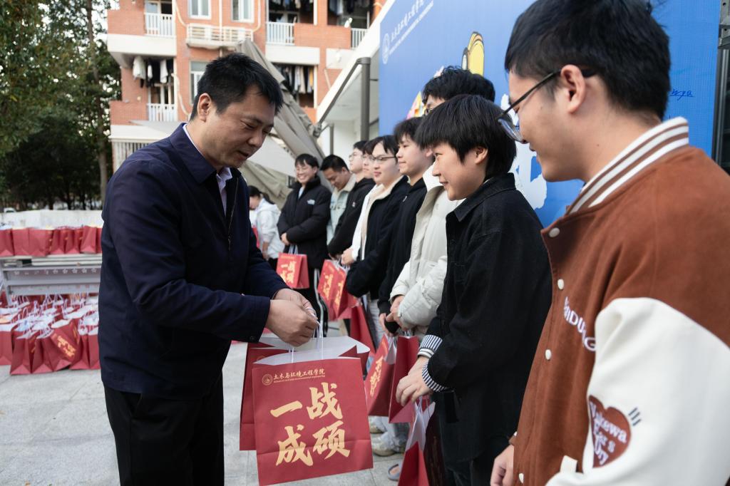 随后,与会领导和老师亲手将一份份满载心意的“考研大礼包”送到学子代表手中。礼包内的每一份物品,都承载着学院对学子们的深情关怀与美好祝愿,让在场学子们深切感受到了来自学院的温暖与力量,备受鼓舞。同学们纷纷表示,将把这份关怀转化为冲刺备考的强大动力,以时不我待的紧迫感全力以赴,以最饱满的状态迎接考试,力争交出优异答卷。