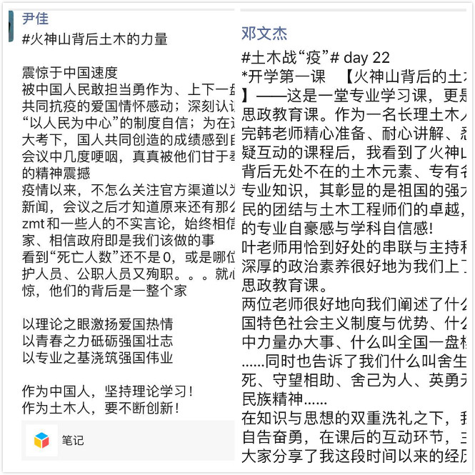 聊天框里热评如潮,主讲老师引人入胜的讲授引发了土木学子的专业自豪。“哪有什么基建狂魔,不过是一群善良朴实的建设者披上铠甲挺身逆行。在抗击疫情的战场上,各行各业用行动践行着自己的职业信条。医生救死扶伤,军人保家卫国,土木人逢山开路,遇水架桥!专业强国,实干兴邦。无论是在岁月静好中,还是在国家危难时,土木人都大有可为,大有作为!”在研究生课程思政分会场,主持人胡蓉勉励土木研究生以扎实的专业知识和务实的土木精神投身中国梦的伟大实践,将青春热血奉献在祖国最需要的地方。