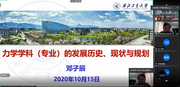 2020年10月15日上午,受土木工程学院邀请,西北工业大学航空学院院长邓子辰教授在线作了题为“西北工业大学力学学科(专业)的发展历程、现状和规划”的学术报告。报告会场设在工科二号楼B302学术报告中心,由校科研部部长王磊教授主持,土木工程学院副院长韩艳教授、蒋友宝教授以及部分老师、研究生共130余人参加了本次报告会。
