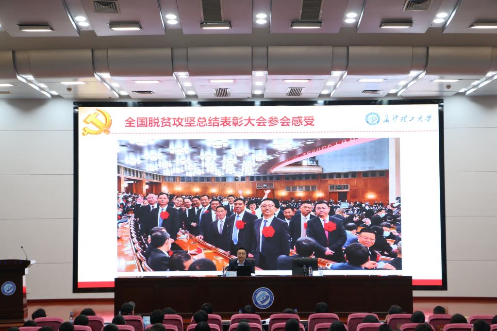 报告中,通过播放枧杆山村扶贫攻坚的宣传视频,生动形象地展示了驻村工作队的责任、能力担当。整场报告会围绕“全国脱贫攻坚总结表彰大会参会感受、在扶贫一线中深化对脱贫攻坚的认识、深刻感受党的伟大和社会主义制度的优越性、在全面推进乡村振兴中继续砥砺前行”四个方面展开。他回忆参加了全国脱贫攻坚总结表彰大会参会感受,并深刻指出,全面建成小康社会是我党的庄严承诺,脱贫攻坚事关党的执政安危和人心向背,必须深刻认识到社会主义必须要让广大人民群众共享改革发展成果。他强调,从此次脱贫攻坚战中可以深刻感受到党的伟大和社会主义制度的优越性,要想打赢脱贫攻坚战,必须坚持党的领导这一根本保障、坚持以人民为中心这一价值追求,以习近平总书记扶贫重要论述作为行动指南,深刻认识到党的伟大和社会主义制度的优越性,必将在全面推进乡村振兴中继续砥砺前行。他寄语全体青年:希望大家能在艰苦奋斗中坚定信念、在认真学习中练就过硬本领、在为民服务中发扬奉献精神,并在建党百年之际,认真学习党史,学习习近平新时代中国特色社会主义思想,与国家一起向着"两个一百年"目标奋斗!
