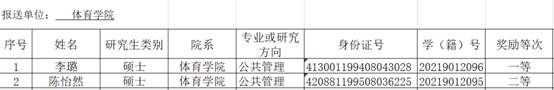 公示期2020年10月11日-2020年10月15日下午17:00,对公示名单有意见的单位或个人可以在公示期间向体育学院研究生奖学金评审委员会以书面形式反映,要求反映的情况属实、实名反映。联系电话:85258276。