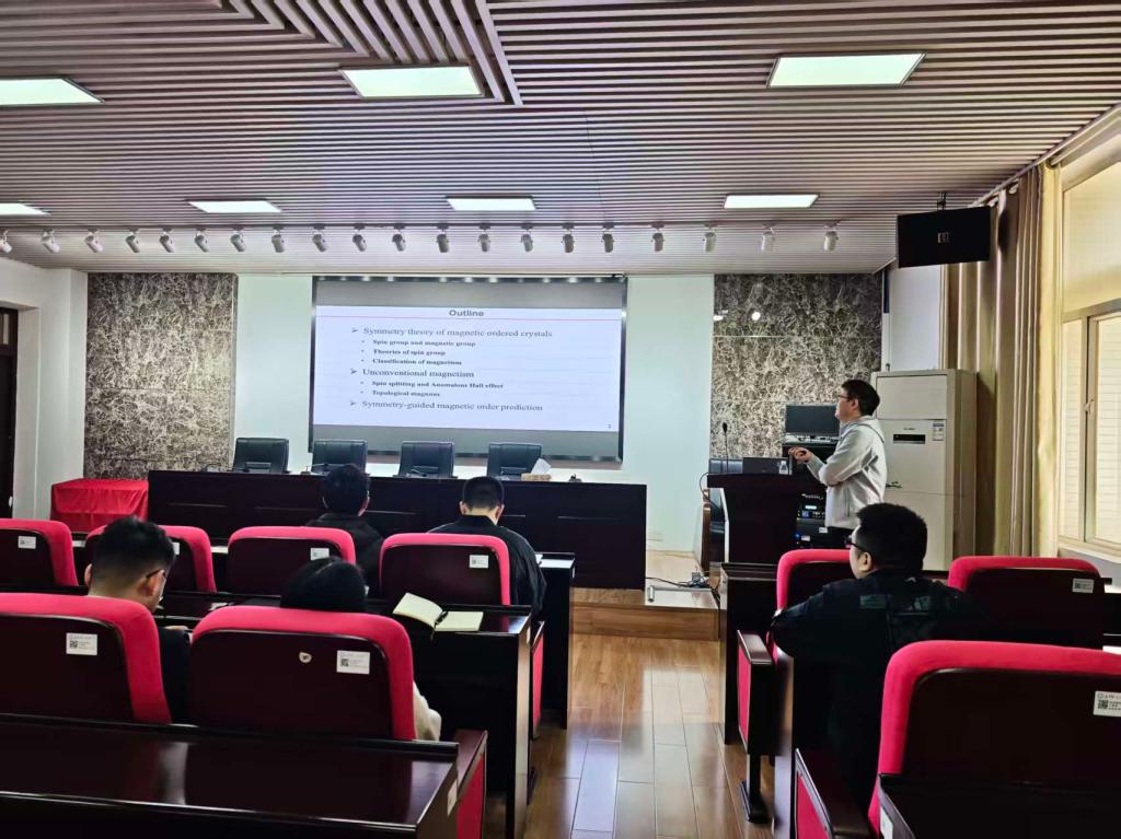 2025年11月11日上午10点,我院邀请到粤港澳大湾区(广东)量子科学中心陈晓冰副研究员进行学术交流。陈晓冰副研究员在理科楼B413会议室为我校师生带来了一场主题为《自旋群与非常规磁性》的精彩学术报告。我院共60余名师生积极参加了此次学术报告会,本次会议由张卫兵教授主持。