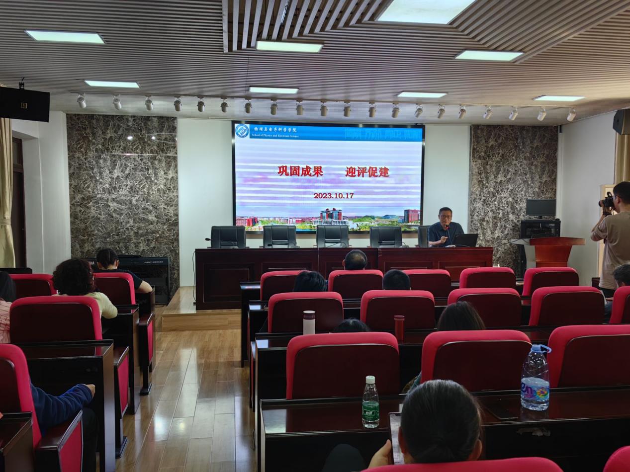 为扎实推进本科教育教学审核评估工作,落实学校关于新一轮本科教育教学审核评估工作的要求,深化审核评估的内涵理解,物电学院10月17日下午2点30分,在理科楼B413组织全体教职工