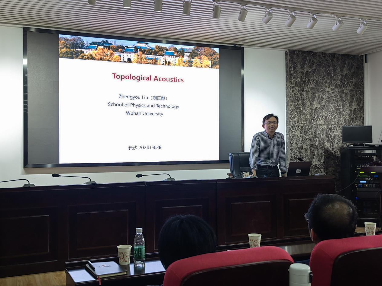 2024年4月26日上午,武汉大学刘正猷教授和昆明学院杨海教授应邀来我院进行交流指导,与学院部分教师代表组织了座谈,学院张卫兵介绍了学院的相关情况。随后刘正猷教授在理科楼B413会议室作了题为《拓扑声学》的学术讲座会议由唐立军教授主持,百多名师生参加。