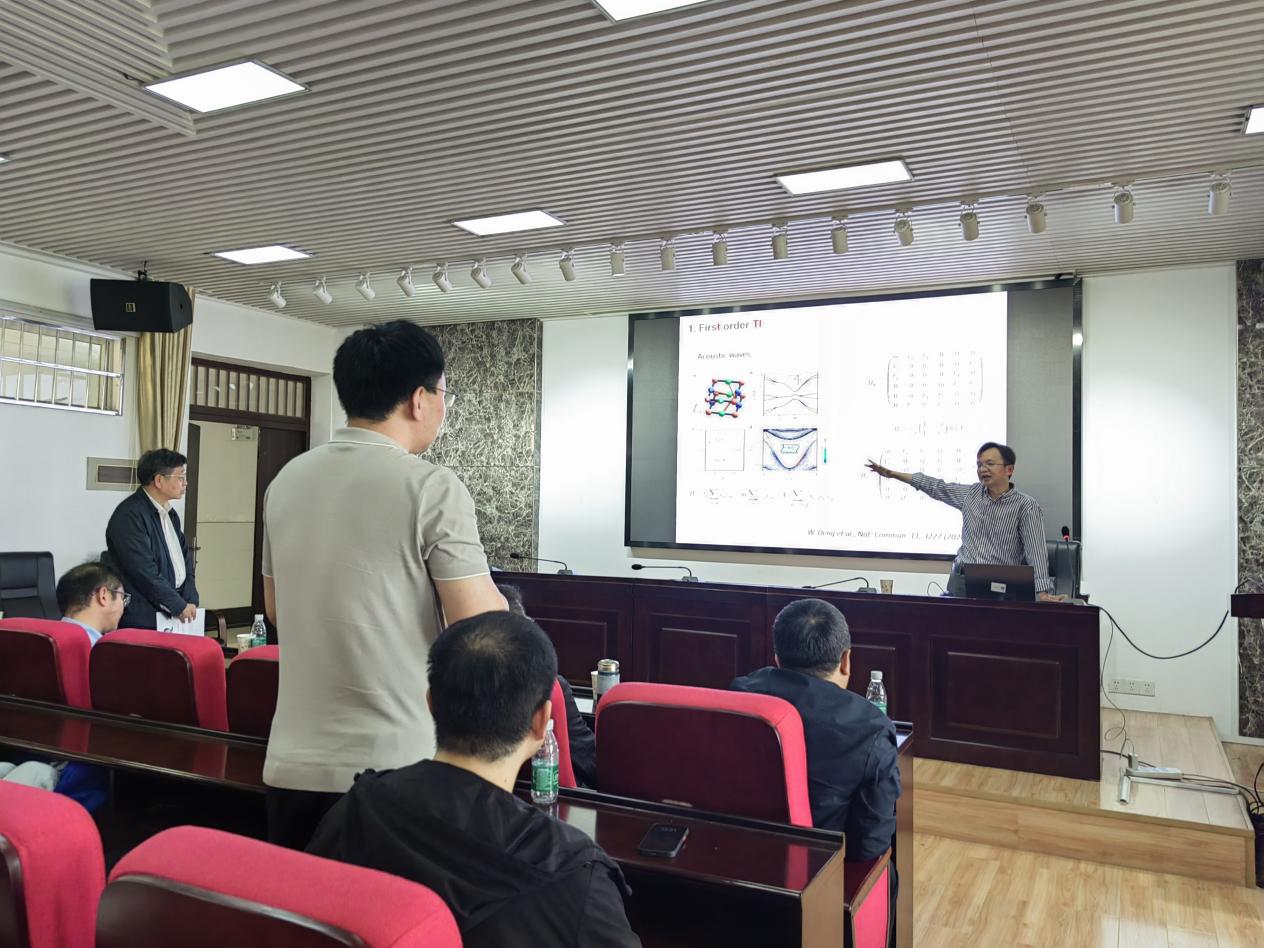 学术讲座开始时,刘正猷教授先以一个充满趣味的问题作为开端,并以该问题为切入点开始介绍关于声子晶体拓扑声波态的相关研究,内容涉及声波能谷绝缘体、拓扑绝缘体以及拓扑半金属等,并讲解了其中各种声波拓扑态的特性。