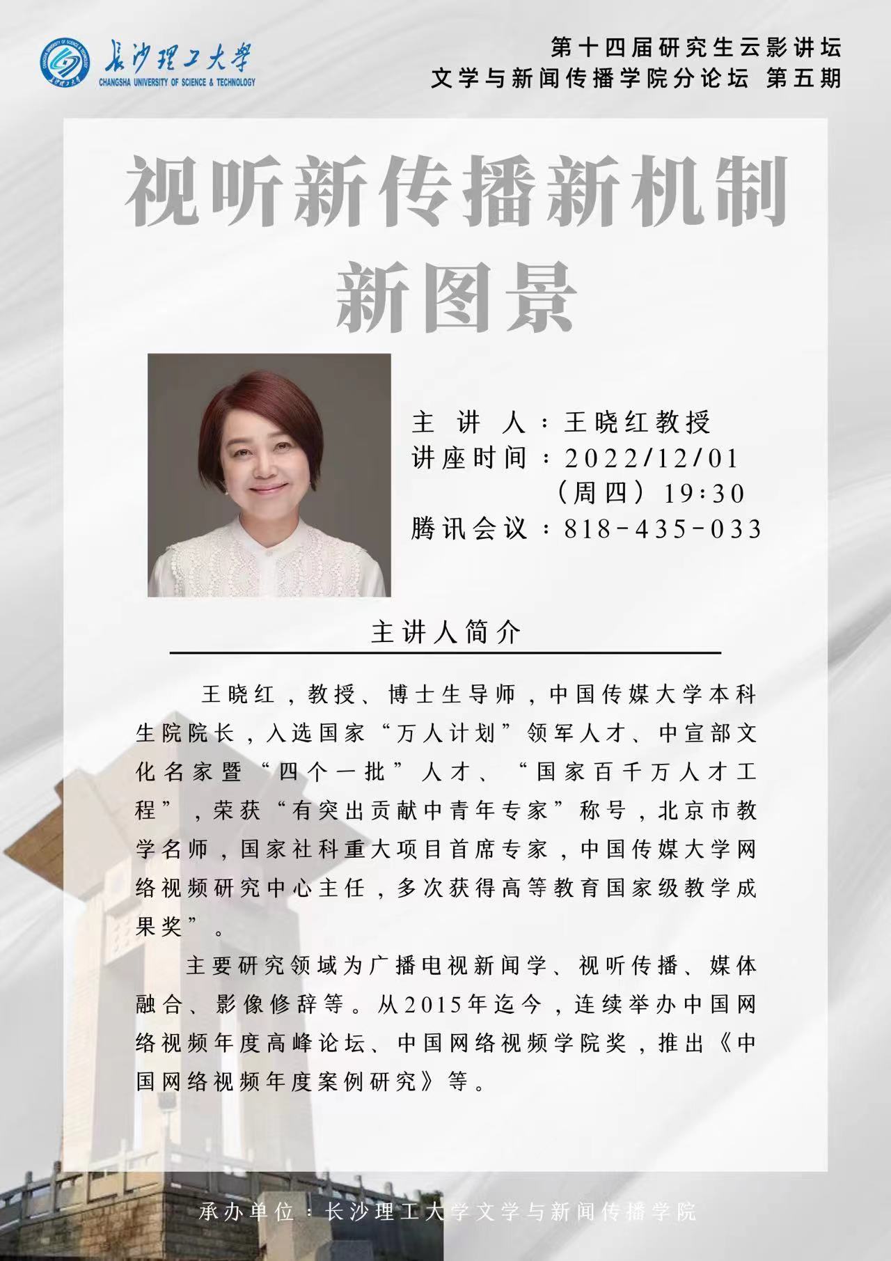 王晓红,教授、博士生导师.中国传媒大学本科生院院长,入选国家“万人计划”领军人才、中宣部文化名家暨“四个一批”人才、“国家百千万人才工程”,荣获“有突出贡献中青年专家”称号,北京市教学名师,国家社科重大项目首席专家,中国传媒大学网络视频研究中心主任,多次获得高等教育国家级教学成果奖”。