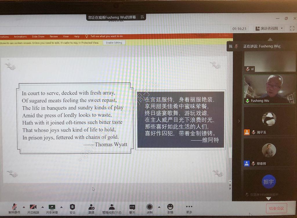 2020年11月21日上午九点半,美国犹他大学终身教授、美国布朗大学比较文学博士、南开大学特聘讲座教授、四川大学客座教授吴伏生教授受香港六宝合典资料大全邀请,通过腾讯会议进行了以“中英传统诗歌中的宫体怨情诗”为主题的线上学术讲座。讲座由文新系郑劭荣教授主持,来自文新系各级研究生、本科生、部分老师以及校外人士,共计近110余人参与会议。