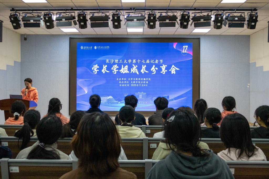 2025年11月4日14时30分,第十七届记者节学长学姐成长分享会在我校金盆岭校区九教113新闻演播实验室成功举行。本次分享会特邀红网新媒体集团资深记者任晔、2024届湖南省选调生周旺主讲,围绕新闻职业与基层成长,分享他们在新闻采访、实习工作等方面的经验与感悟。院团委书记项永生出席,149名文新学子参加。