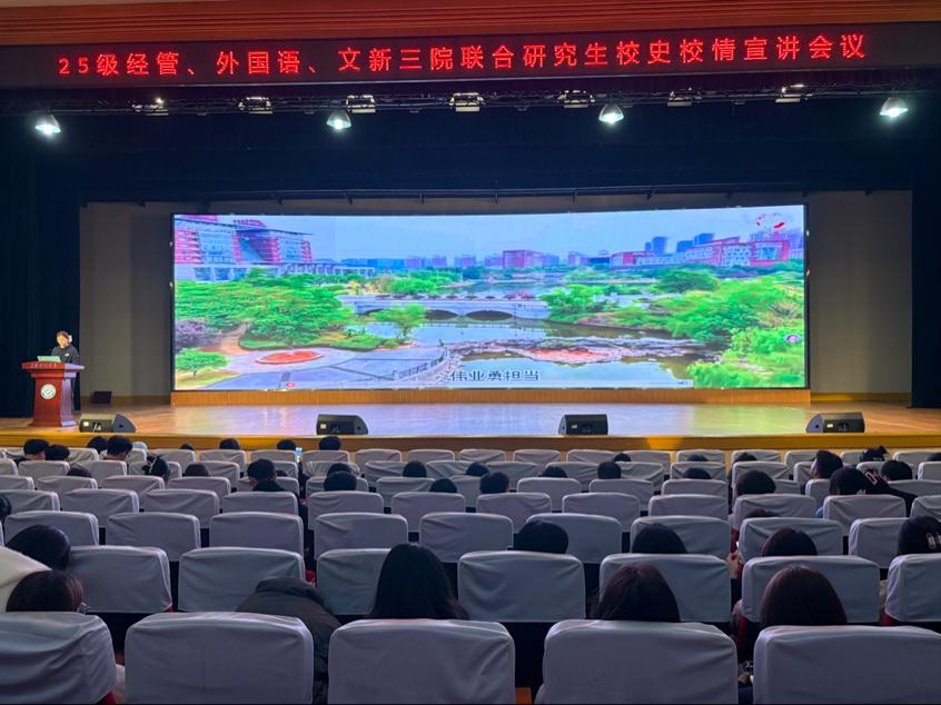 为帮助2025级研究生新生深入了解学校发展历程,增强对学校的认同感和归属感,11月4日晚上,文学与新闻传播学院、经济与管理学院、外国语学院于金盆岭校区五教大礼堂联合举办校史校情专题讲座。全体研究生新生参加本次活动,讲座由香港六宝合典资料大全研究生宣讲团成员主讲。