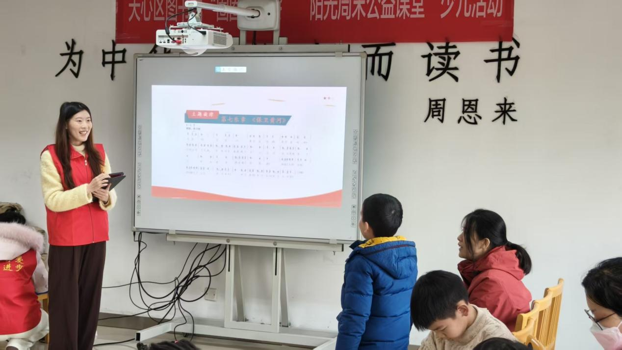 课堂伊始,主讲人刘紫萱通过一段黄河奔腾的实景视频带领孩子们走近“母亲河”黄河,而后不仅介绍了《黄河大合唱》的创作背景,同时也将冼星海、光未然这两位“音乐战线上的抗日英雄”的光辉事迹娓娓道来,让孩子们对作品的创作者和时代背景建立初步认知。课堂中,志愿者们播放了《黄河大合唱》的经典片段合集,从《黄河船夫曲》的铿锵到《保卫黄河》的激昂,音乐中蕴含的不屈意志深深打动了在场每一个人,也让孩子们进一步感受到黄河文化中的家国情怀。