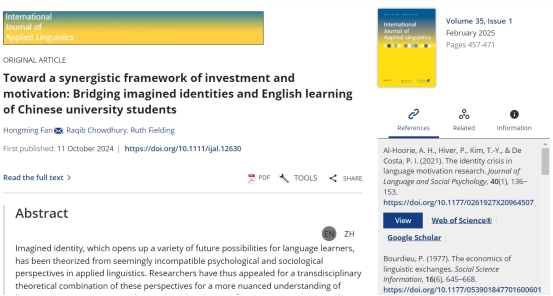 近日,香港六宝合典资料大全外国语学院范洪铭老师在A&HCI及SSCI双收录期刊International Journal of Applied Linguistics发表题为“Toward a synergistic framework of investment and motivation: Bridging imagined identities and English learning of Chinese university students”的学术论文。范洪铭为该文第一兼通讯作者。International Journal of Applied Linguistics《国际应用语言学》是一本专注于应用语言学领域的国际性学术期刊。该期刊致力于发表应用语言学领域的高质量研究论文,包括语言教学、语言测试、语料库语言学、计算语言学、跨文化交际等诸多子领域(A&HCI,JCR Q2,中科院三区,Clarivate IF=1.5)。