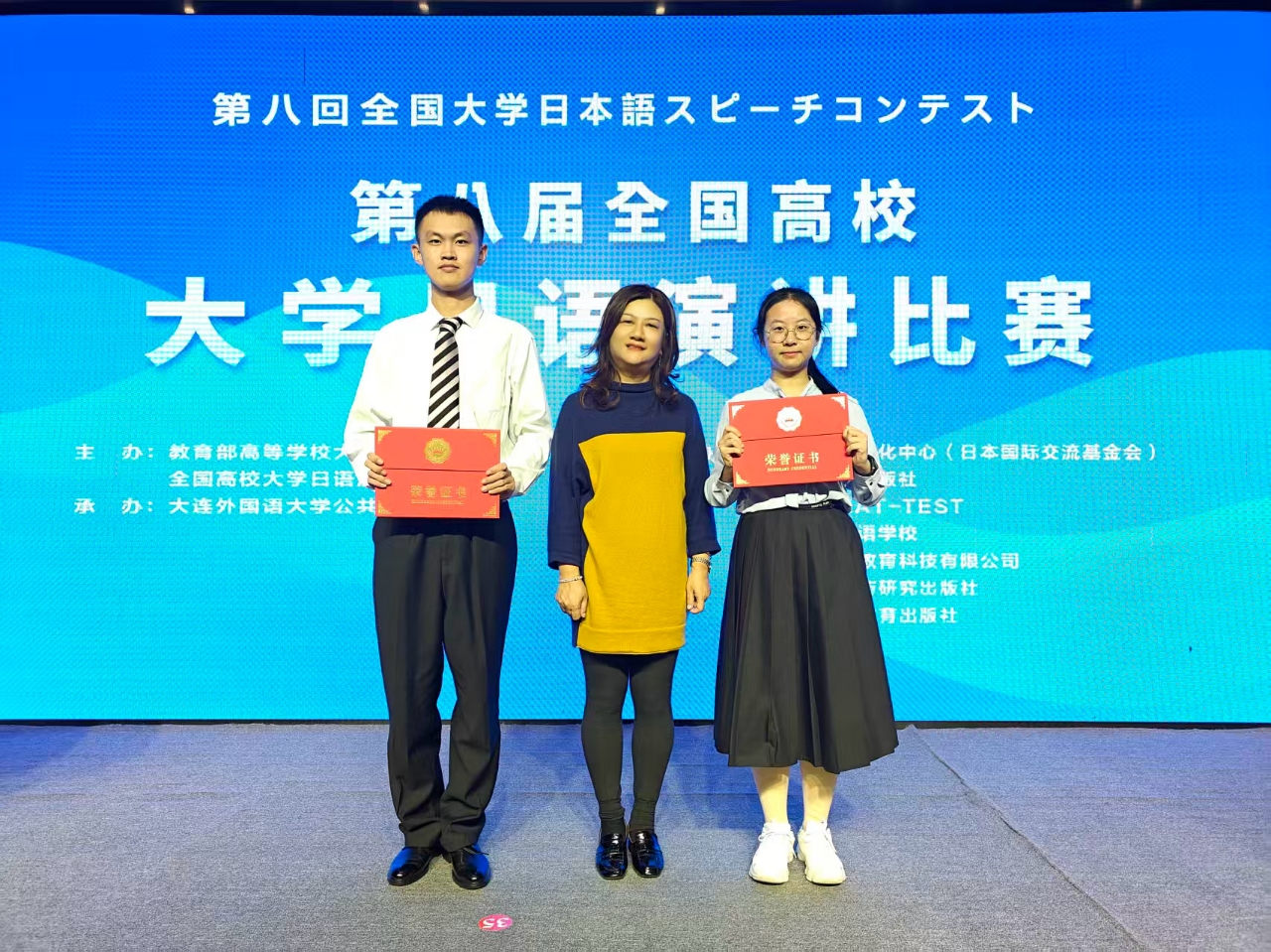 10月18日,由教育部高等学校大学外语教学指导委员会主办的第八届全国高校大学日语演讲比赛决赛在大连外国语大学落幕。在外国语学院教师的指导下,城南学院周宇星同学和经管学院彭胤维同学分别荣获全国一等奖、二等奖,实现了我校在国家级日语竞赛中的历史性突破,展现了我校高质量的小语种教学工作。