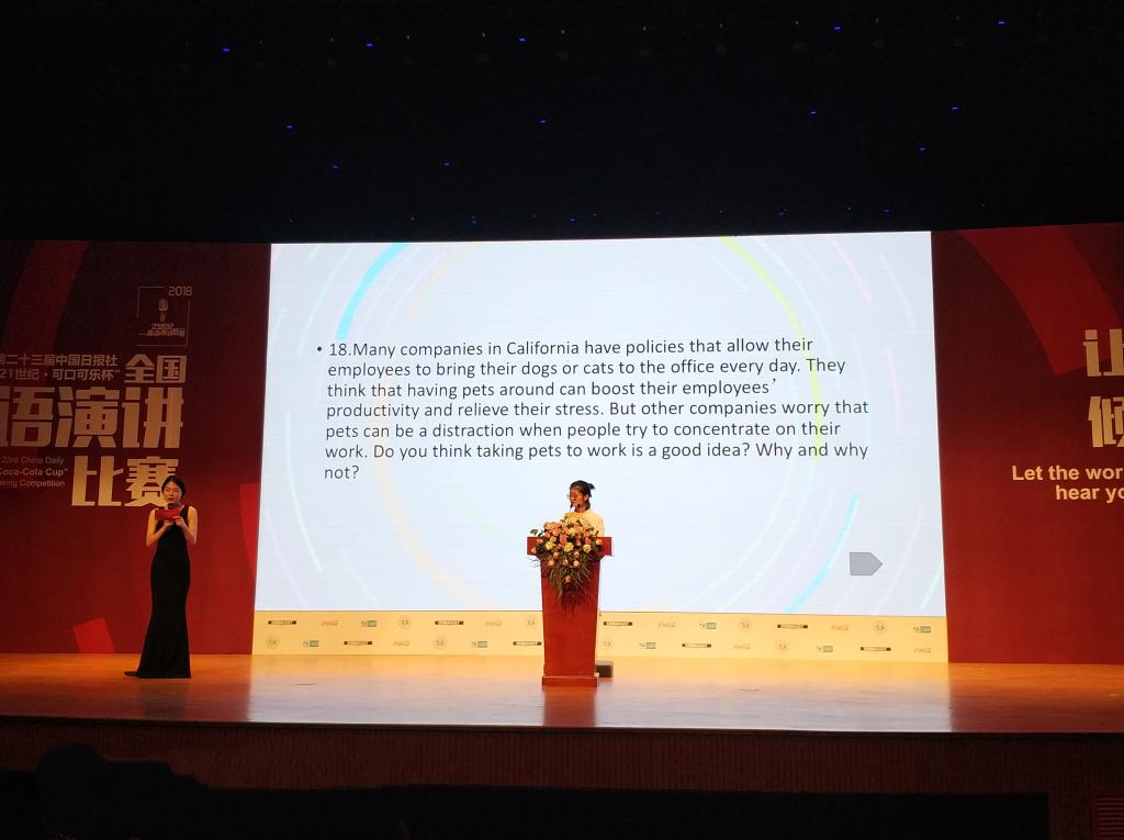 4月12日至15日,第二十三届中国日报社“21世纪 •可口可乐杯”全国英语演讲比赛(大学组)总决赛在杭州师范大学举行。来自中国大陆及港澳台地区的72所高校选手齐聚杭州展开激烈角逐。我校2016级环境工程专业学生余大婷在外国语学院公共外语部谷丰老师的指导下参加了比赛。