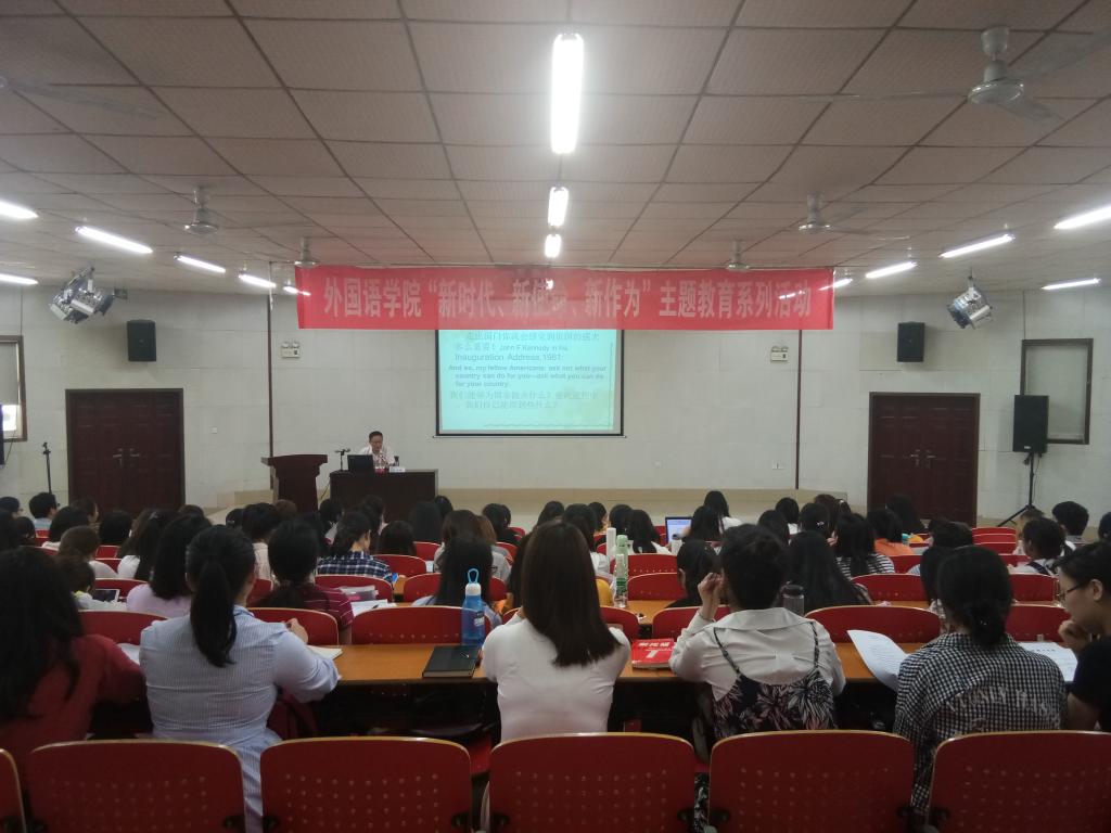 5月9日下午,外国语学院在文科楼圆厅A100举行“新时代新使命新作为”大学生主题教育系列活动启动仪式。院长段胜峰、党委副书记陈仁凯出席。学院全体本科生党员、团委学生会全体干部、文化摆渡者协会会员代表、各班团支书和宣传委员和2017级全体学生参加。