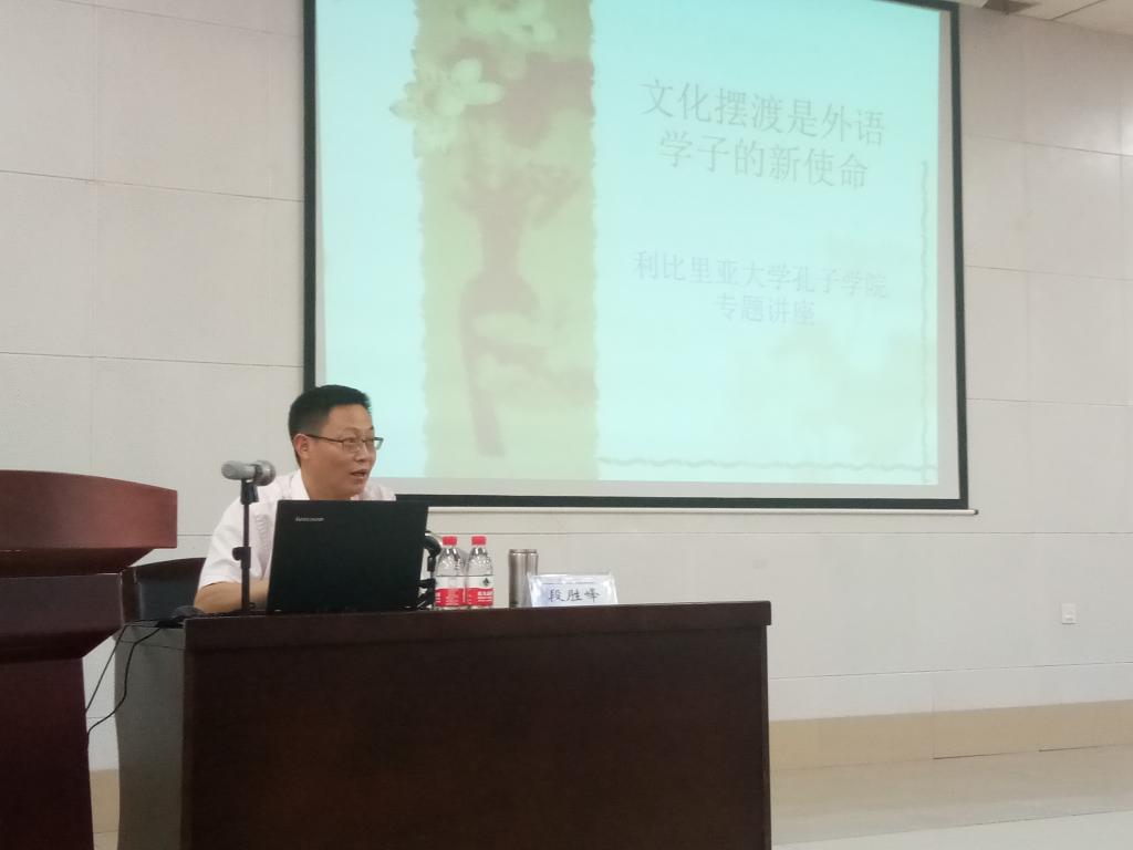 简短的启动仪式之后,段胜峰作首场报告。他以“文化摆渡是外语学子的新使命”为题,结合他在利比里亚大学孔子学院三年多的工作经历,详细介绍了我国文化“走出去”战略和孔子学院项目,以丰富的实景图片再现了在利比里亚教授汉语、推广中华文化、加强民间交流等“文化摆渡”工作。他曾担任我校利比里亚大学孔子学院的首任中方院长。谈及孔院草创之时的艰辛,面临缺场地、缺学生、缺支持、缺理解的困境,他感慨万分,饱含深情地说道:“我的背后是祖国,这种朴素的爱国情怀激励着我必须去奋斗。祖国把我派到这里来,就是让我来奋斗的!”报告会现场不时响起热烈的掌声。