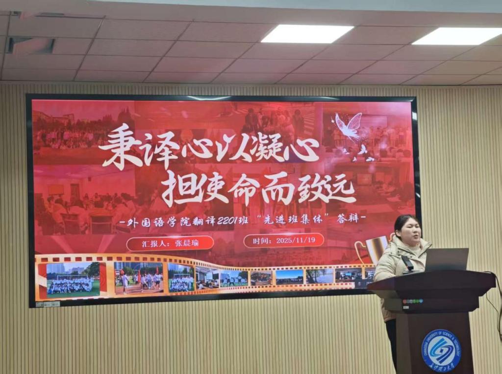 11月19日晚,外国语学院于金盆岭校区3号教学楼229教室组织开展2025-2026学年先进班集体验收评比大会。本次大会由办公室干事李梦谣主持,毛婕老师、我院团委学生会办公室全体成员及22级至25级全体班长参会。