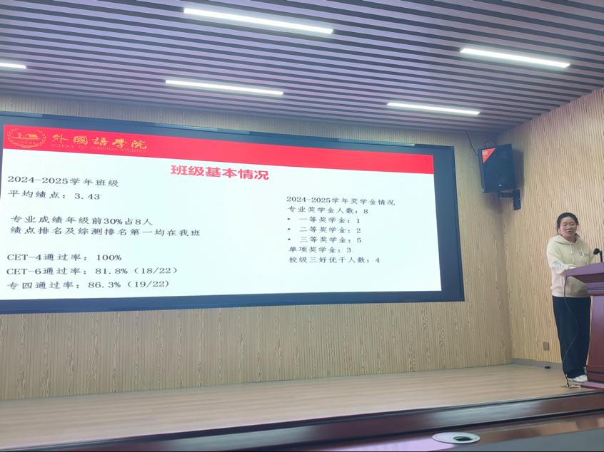 本次大会分为班级展示,总结点评两个环节。在班级展示部分,英语2201班、英语2301班和翻译2201班的班长分别从班级概况、学风建设、班风建设、社会实践、班级荣誉等方面进行了先进班集体竞选答辩,表述清晰有力。