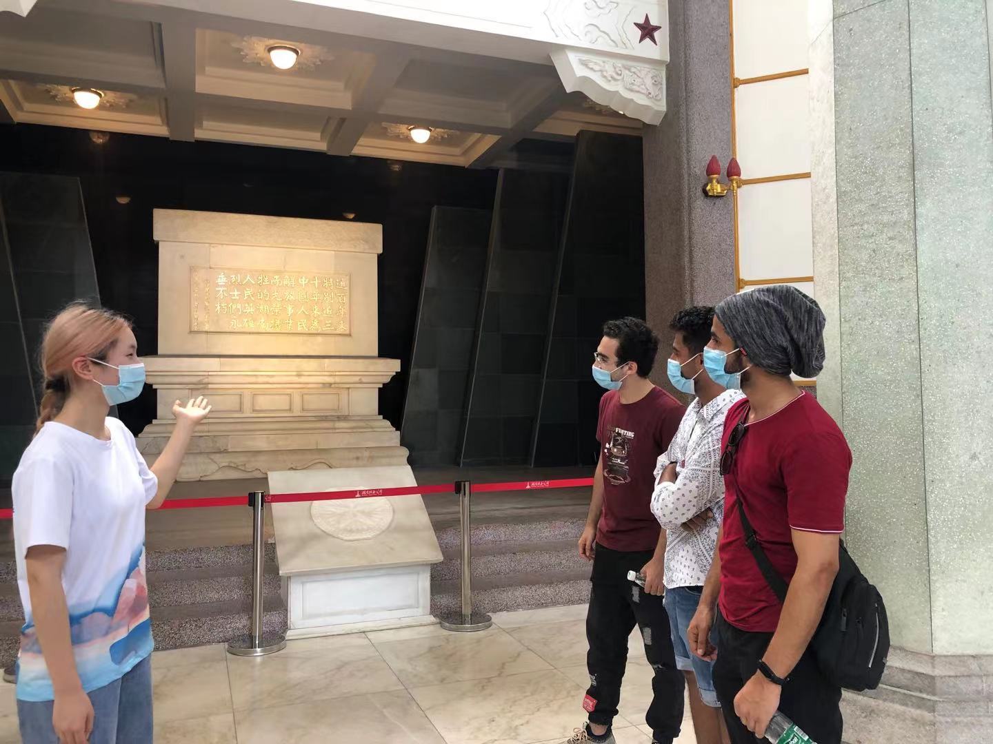 首先,她向来自埃及与也门的外国友人们就位于公园中央的苏联红军烈士纪念碑进行了解说。在烈士纪念馆大厅的前面矗立着一块基石,上面刻着:“近百年来特别是近三十年来为中国人民解放事业而光荣牺牲的湖南人民英雄烈士们永垂不朽”。纪念馆两侧为陈列厅,陈列了7万多名湖南烈士的名字。