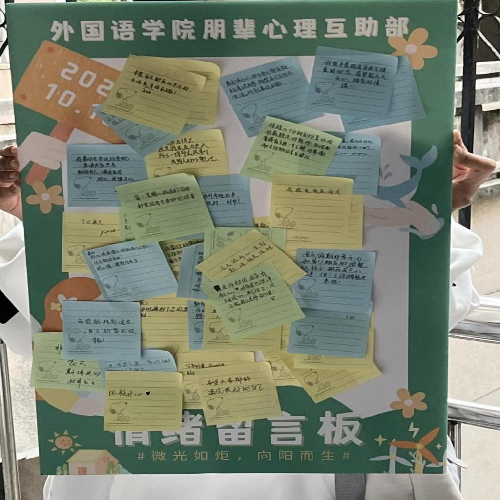 为加深外院学子对世界精神卫生日的了解,呵护同学们的心理健康,鼓励同学们增强自我关怀,帮助同学们寻找适合自己的纾解情绪的方法,2023年10月10日至2023年10月12日我院朋辈心理互助部开展了“微光如炬,向阳而生”故事分享会活动,本次活动共分为10月10日于3教611进行的线下“情绪留言板”情感共鸣活动和10月10日-10月12日在官q开展的线上“心灵树洞”故事分享活动两个部分。