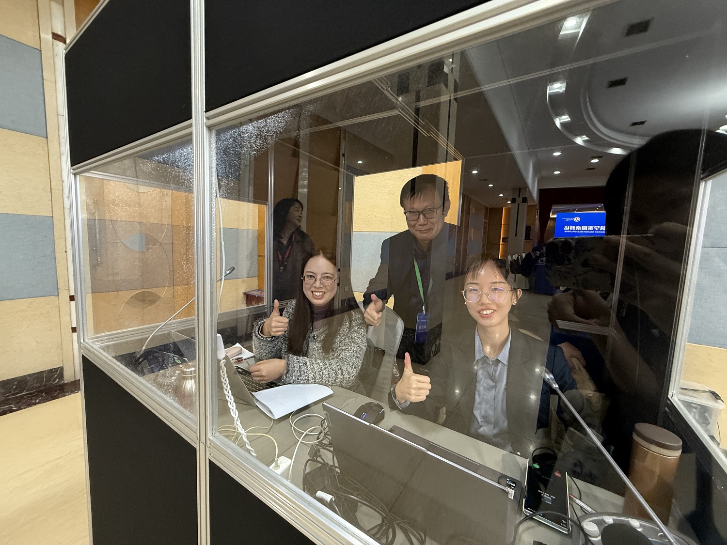 图二:我会秘书长段胜峰、副秘书长王华玲与同声传译译员王昱、宋锴钧