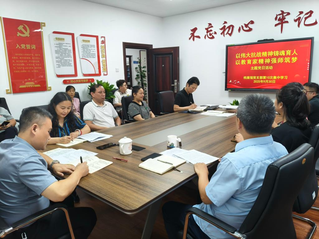 930日,档案馆党支部组织开展了“以伟大抗战精神铸魂育人,以教育家精神强师筑梦”主题党日活动(二)。会议由支部副书记王任飞主持,档案馆全体教职工参加。