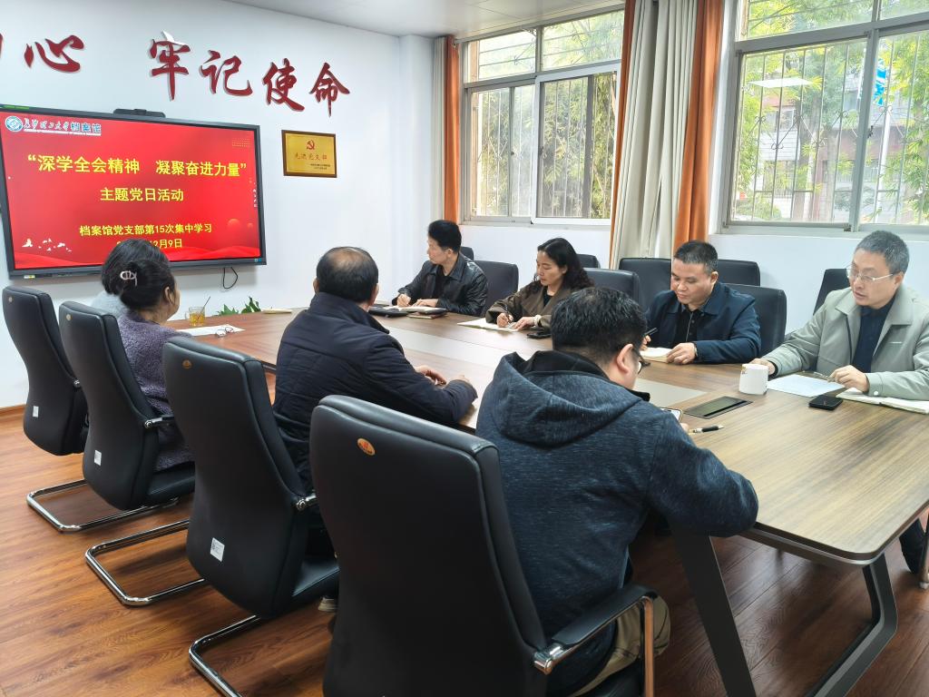 129日,档案馆党支部开展了“深学全会精神 凝聚奋进力量”主题党日活动,会议由支部副书记王任飞主持,档案馆全体职工参加。