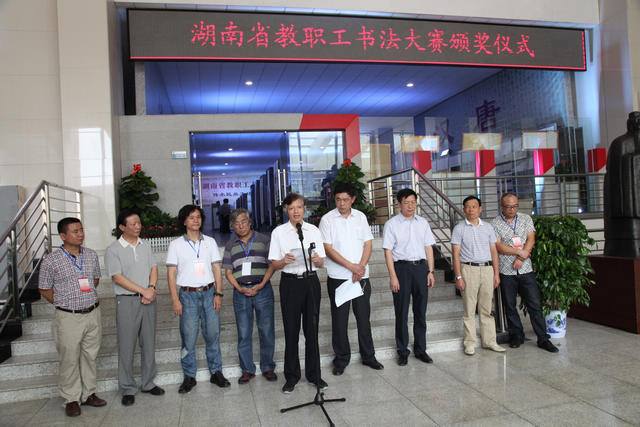 9月28上午在建筑艺术楼举行的颁奖仪式上,湖南省总工会副主席黄新民,湖南省教育工会主席高新民,我校党委书记付宏渊,正校级督导、工会主席甘均良等为获奖者颁奖。全省广大教职工在繁重的教学科研工作之余,用书法艺术言志抒情,展示才智,充分体现了广大教职工丰富多彩的文化生活和健康向上的精神风貌。书法大赛作品展评活动是全省教职工文化生活中的一件大事,同时也为我校校园文化增添了亮丽的色彩。