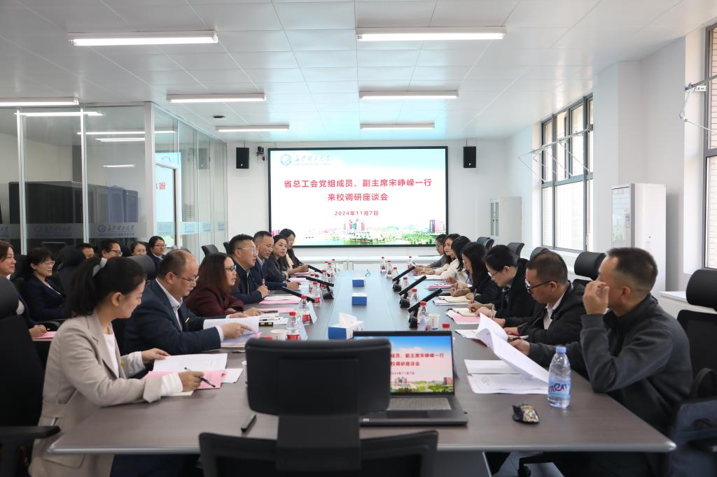 11月7日,湖南省总工会党组成员、副主席宋峥嵘一行来我校进行工作调研。省总经贸建设工会副主任易丽鹏,省教育工会副主席朱冠星,校党委委员、副校长张军辉参加调研。