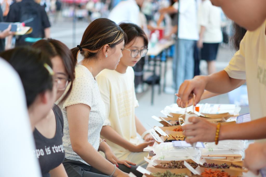 活动现场设置了多块睡眠科普展板,内容涵盖“睡眠障碍的类型与定义”到“常见睡眠问题解答”,以直观形式帮助学生系统了解睡眠健康,成为一堂生动的“户外健康课堂”。围绕“睡眠”主题,游园会设计了多个创意互动环节:“大学生睡眠研究所”中,同学们通过贴纸标注睡眠困扰,“无缘无故睡不着”和“熬夜玩游戏”成为高频标签;“梦境答疑”环节通过观看展板与抽题问答,巩固学生对睡眠常识的理解;“好梦音乐魔法投投乐”人气颇高,学生在音乐与游戏中了解睡眠的层次与重要性;“晚安之香”环节则让大家亲手调配香料、制作香囊,在实践中体会睡眠环境对质量的影响。
