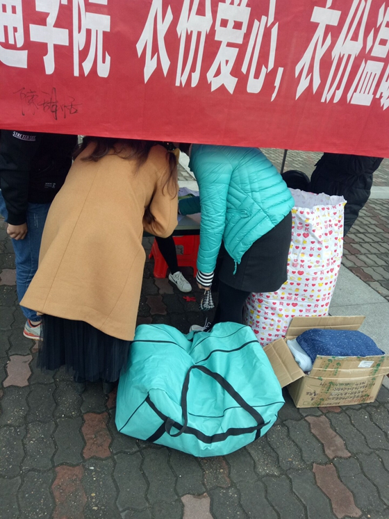 活动主要采用在人流量集中地区摆点的形式,接受个人及团体闲置衣、物的捐赠。活动中,志愿者主动与过往的同学宣传雷锋精神的精髓,介绍此次捐赠活动的意义及目的,积极倡导大家发扬甘于奉献、勇于担当的精神,为山区留守儿童献上自己的爱心。活动共收到捐赠衣、物3大箱子,并将通过“农家学舍”捐往山区留守儿童,为他们带去了需要的物资和暖暖的爱心。