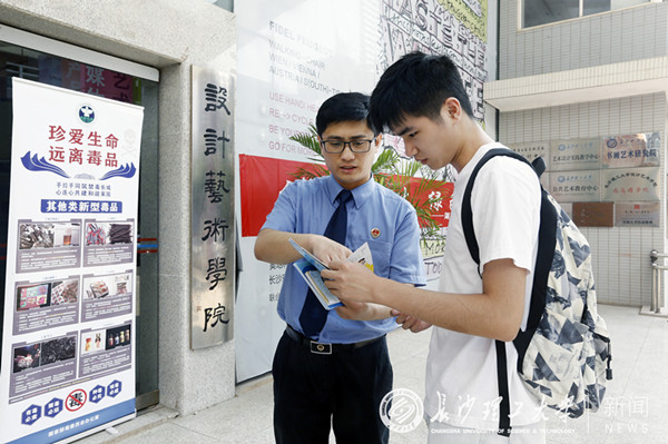 聘任仪式和讲座开始前,由湖南省人民检察院第十一检察部检察官助理组成的“法制宣传先行小分队”在我校校园内面向广大学生开展了禁毒宣传活动,并发放了禁毒知识手册。